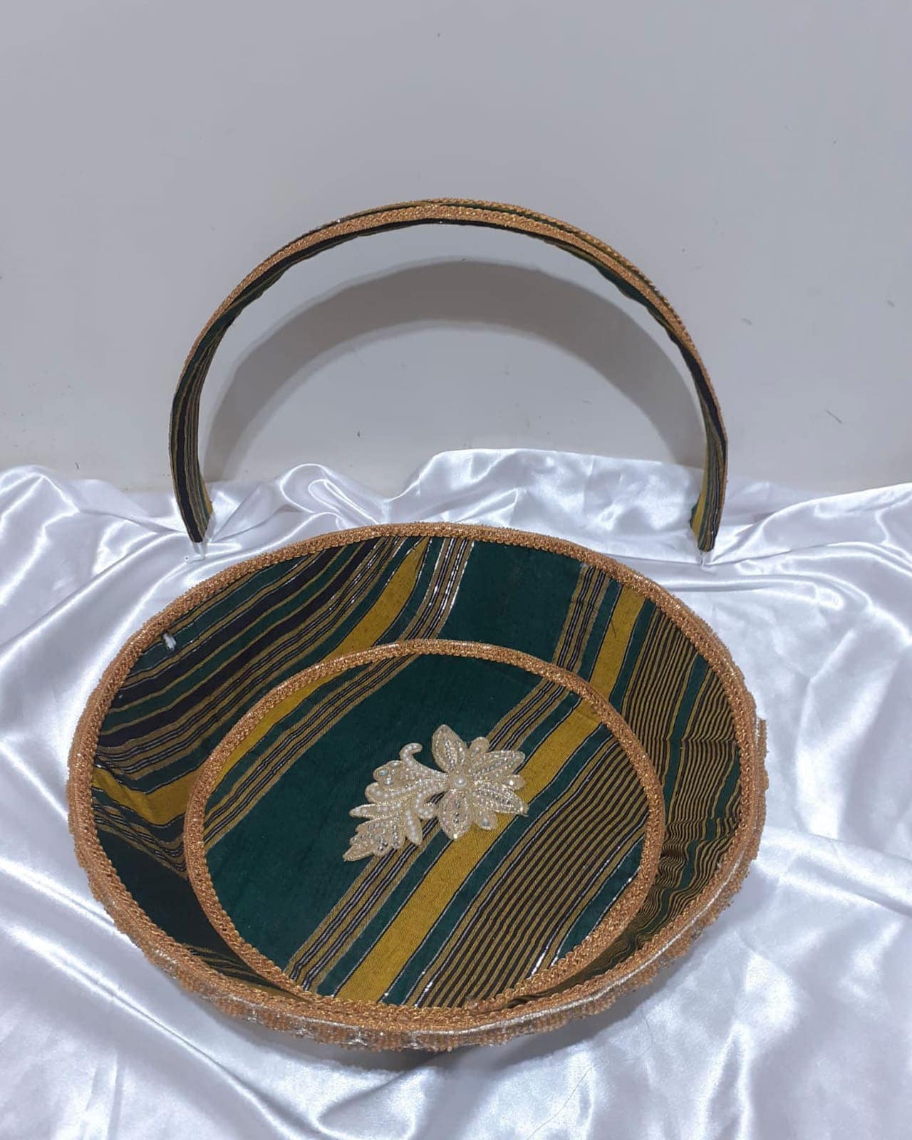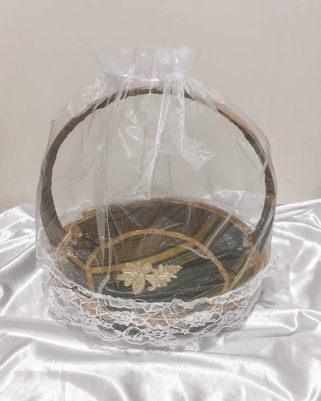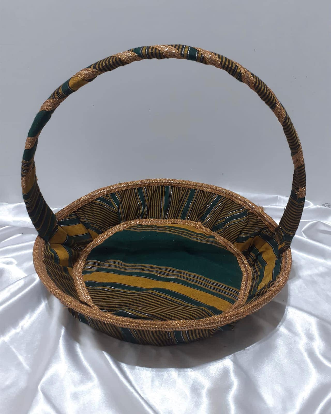Un magnifique panier avec une voile intégré à garnir, enveloppé de tissus saharé ou mkoumi (tissus traditionnel comoriens) pour mettre en valeur le vawo de boina haroussi (le marié en comorien) ou encore les cadeaux de la bibi haroussi (la mariée en comorien).